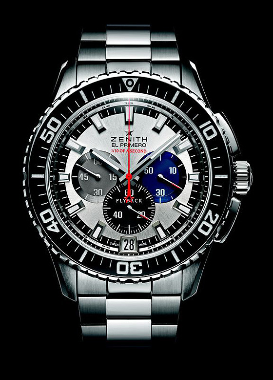 El Primero Stratos Flyback Striking 10th is an iconic presence. The 45,5 mm diameter case is making a statement with its size and significant uni-directional bezel with ceramic insert. You can say immediately that it is a chronograph as you see the contrasting counters as well as the two buttons guarding the crown. The colours are meant to send the mind to the 1960s and to the original El Primero. But inside there is a master piece of technology. Presented first in 2011, the automatic caliber is working at a high frequency – 36000 vph compared to a normal frequency of 18000 vph in most of the watches – and it is capable of timing events with a precision of a 1/10th of a second. And this is thanks to its centre seconds hand that when timing is running as fast as it turns around the dial once every ten seconds. The technical performance goes even higher as the chronograph comes with the flyback complication. Meaning it is possible to reset and restart the timing with just the push of one button and therefore without losing any moment for to stop the chronograph before restarting.