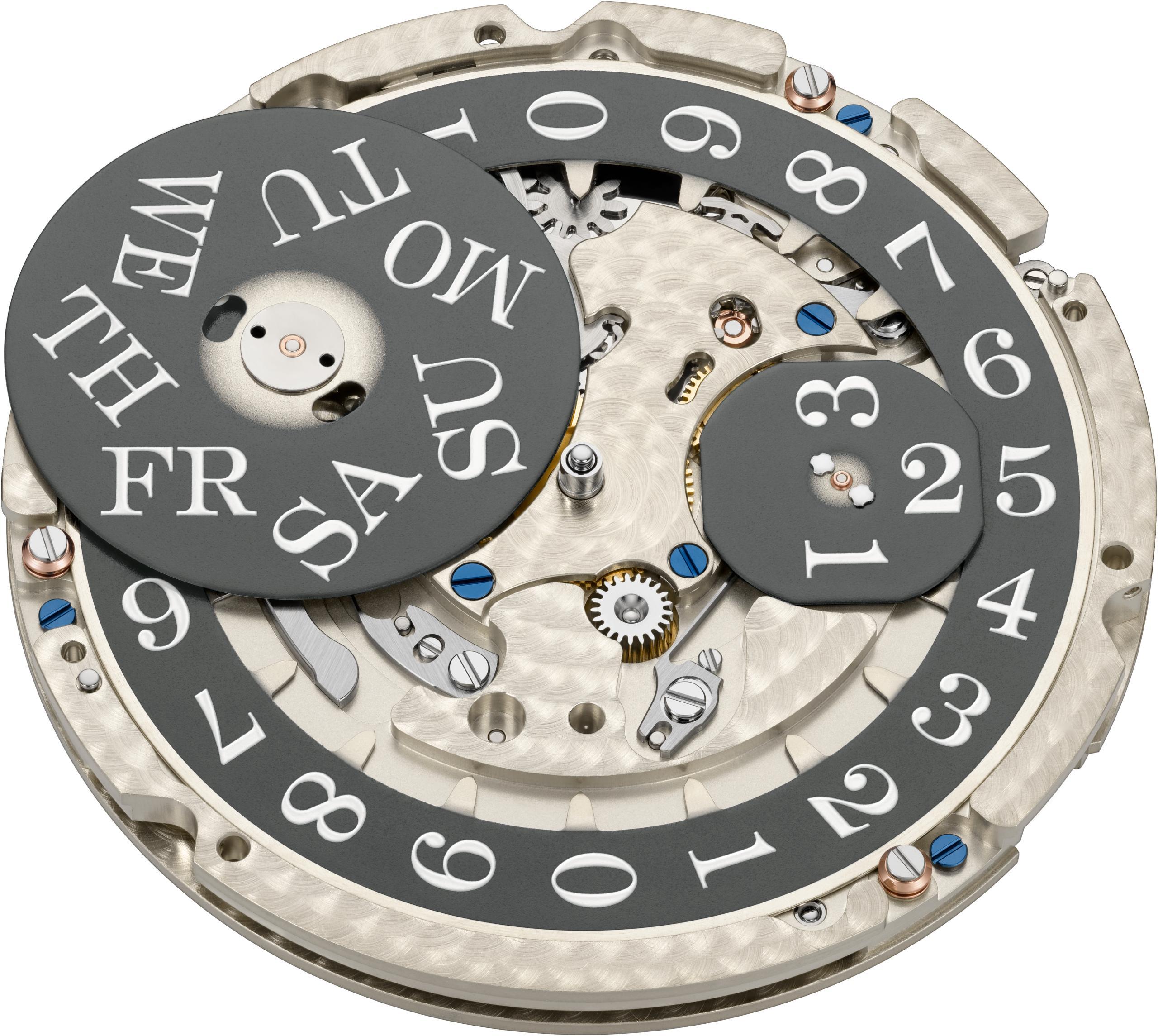 The German Manufacture A. Lange & Sohne decides to reissue one of its emblematic complications. Compared with how almost all minutes repeaters “tell” the time, Zeitwerk offers an original approach in line with its original way of showing the hours and minutes on the dial. Its striking mechanism sounds ten-minute intervals instead of quarter-hours with double strikes. As soon as the striking mechanism is activated with the repeater pusher at 10 o’clock, it sounds the time as indicated on the dial. At 7.52, for instance, the gong hammer on the left strikes the low-pitched gong seven times, once for every elapsed hour. Then, five double tones are struck for the elapsed ten-minute intervals, followed by the right-hand hammer with two high strikes, one for each elapsed minute. The polished gongs and the black-polished gong hammers are subtly integrated in the design of the dial.