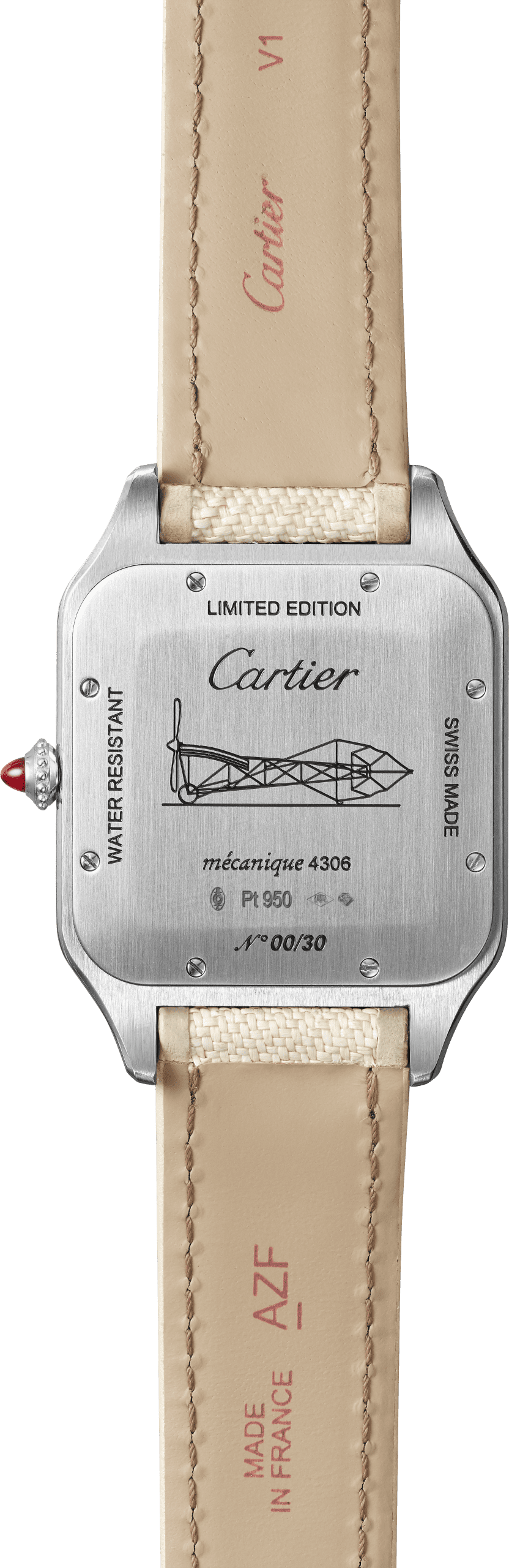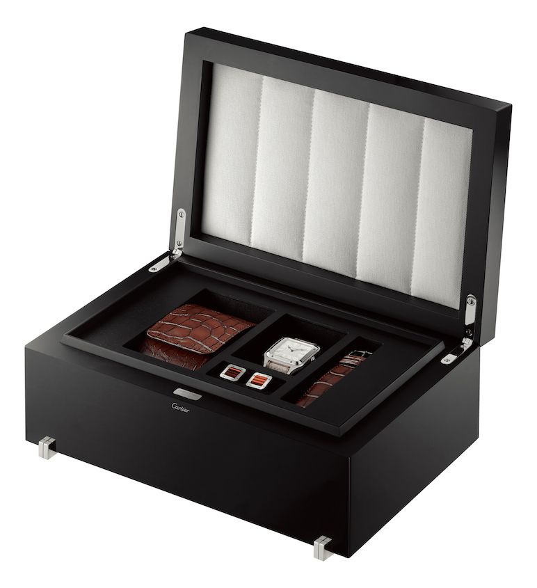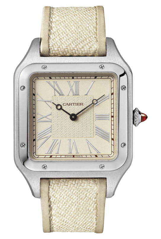 The Santos-Dumont “La Demoiselle” watch, with a lacquered wooden box and precious accessories comes as an extra-large-sized watch celebrating masculine elegance in 30 numbered pieces, engraved with the design of “La Demoiselle”, the most elegant of Santos’ flying machines. This platinum watch with ruby cabochon was created in homage to Alberto Santos-Dumont, the pioneering dandy whose silhouette is inseparable from the panama hat he was never seen without. Cartier pays tribute to this stylish accessory by using a made-to-measure Panama-weave strap. Created in 1908, “La Demoiselle” engraved on the case back is Alberto Santos-Dumont’s most accomplished flying machine, and one of the first aircraft to be mass produced. With it began a new era: “And we will sail through the air seeing Europe unfold at our feet like a geographical map. There we will remain, suspended between the stars and the earth.” All the 30 pieces are sold only with a series of accessories included in a special lacquered maple wood box.