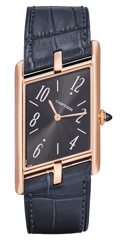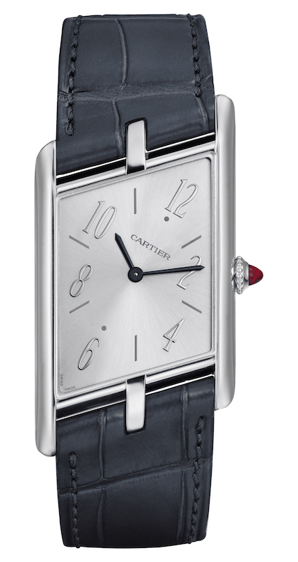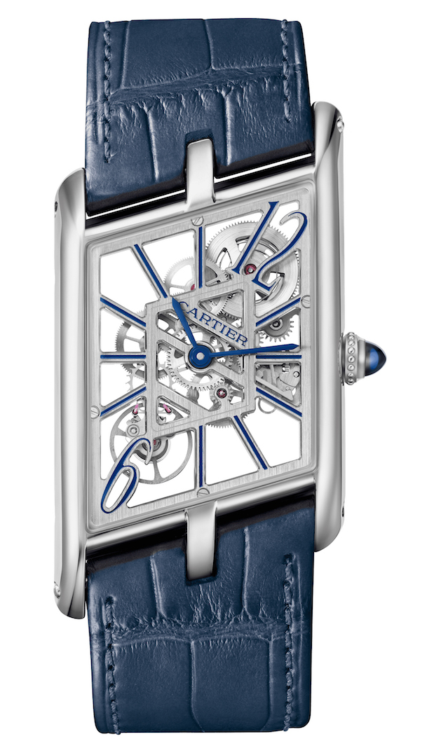 Tank Asymetrique comes also as a skeleton with a specially developed hand-wound calibre with a 48 hours power reserve The watch comes in pink gold on a brown or grey strap, in platinum on a blue or black strap, and in a gem-set platinum version on a black or glossy blue strap. Made to measure, these straps are fitted with an ardillon buckle, a rare option in Fine Watchmaking. An elegant and unique watch, created in a limited series of 100 numbered pieces for each aesthetic.