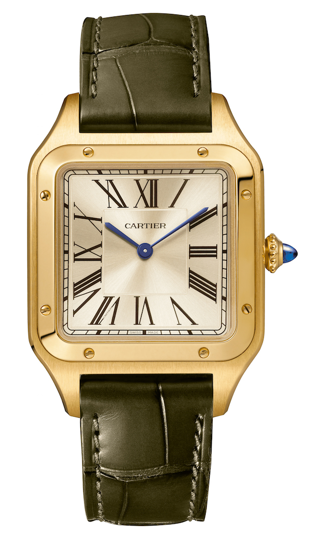 The “La Baladeuse” Santos-Dumont watch comes in a yellow gold case, champagne dial, sapphire winding crown, blued sword-shaped hands and patinated green alligator-skin strap.